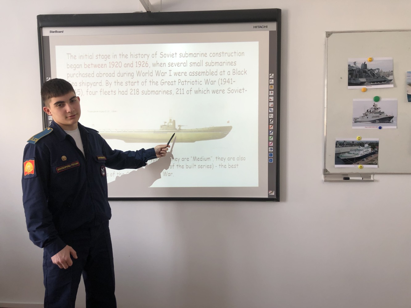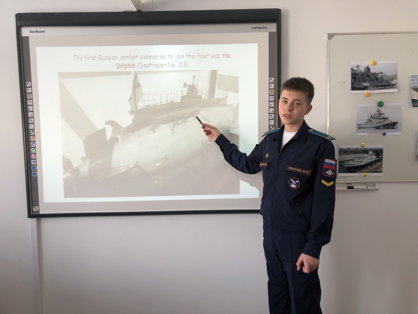 Для кадет 9А класса этот урок был полезным не только для изучения языка, но и для углубления знаний об истории и достижениях подводного флота России. Кадет Евсеев Егор рассказал об участии серии подводных лодок так называемой рыбьей серии (по названиям «Дельфин», «Скат», «Налим» и т. д.) в боевых действиях в Русско-японской войне 1904–1905 гг., наличие которых в составе сил, предназначенных для обороны Владивостока, заставило противника отказаться от действий против русской военно-морской базы.
